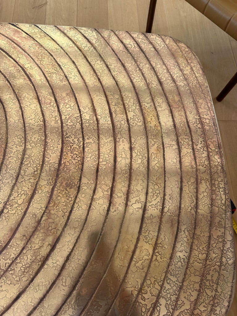 The piece is inspired by the work of Ado Chale, the Belgian artist and designer known for his sculptural bronze tables and unique textured surfaces.