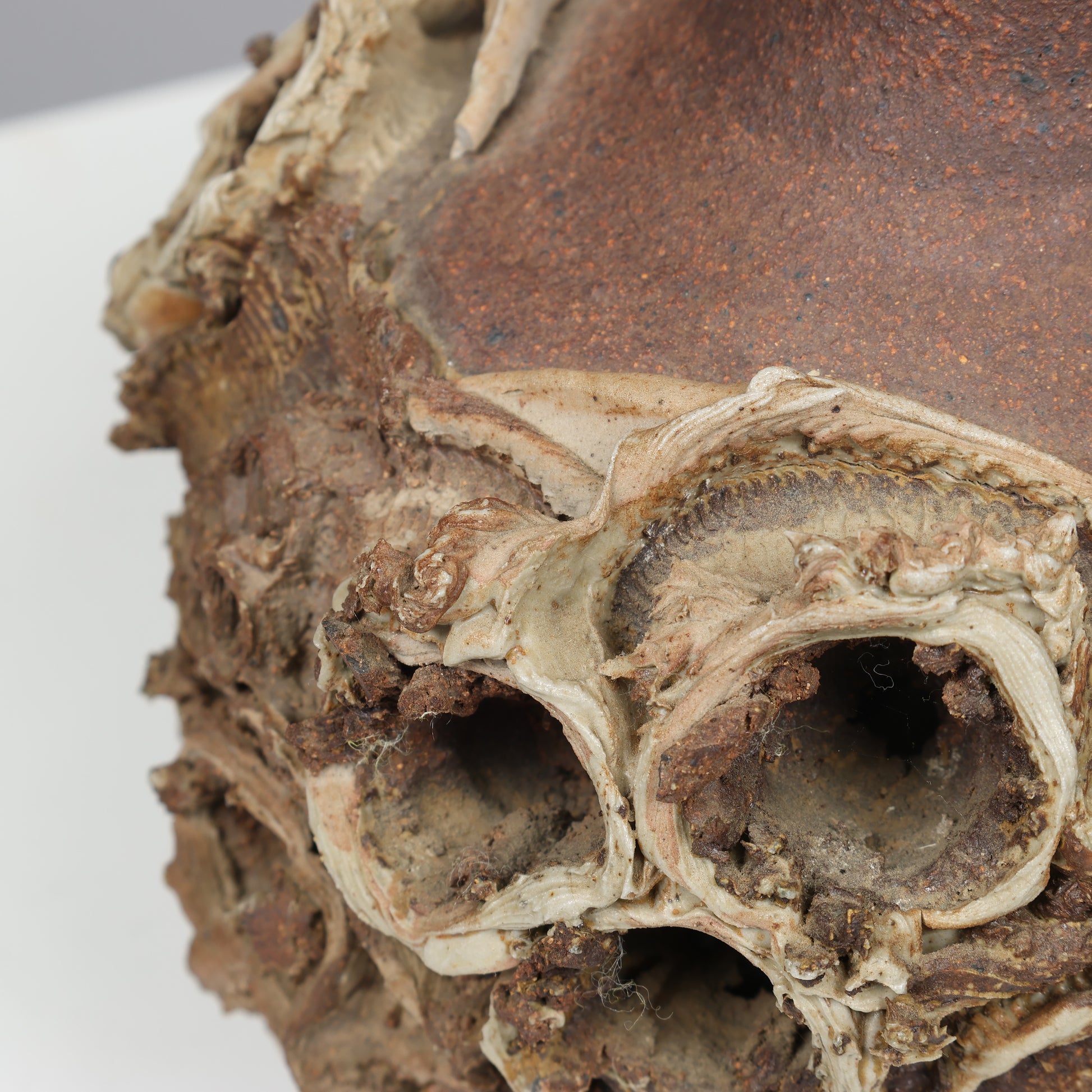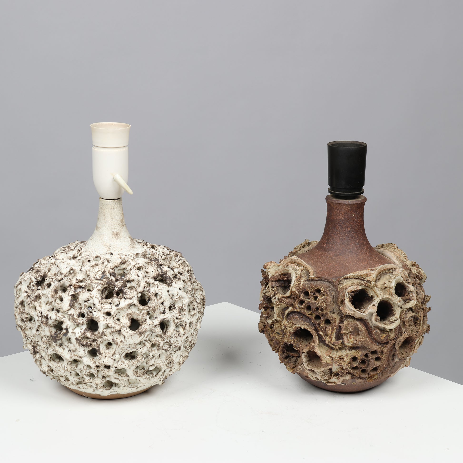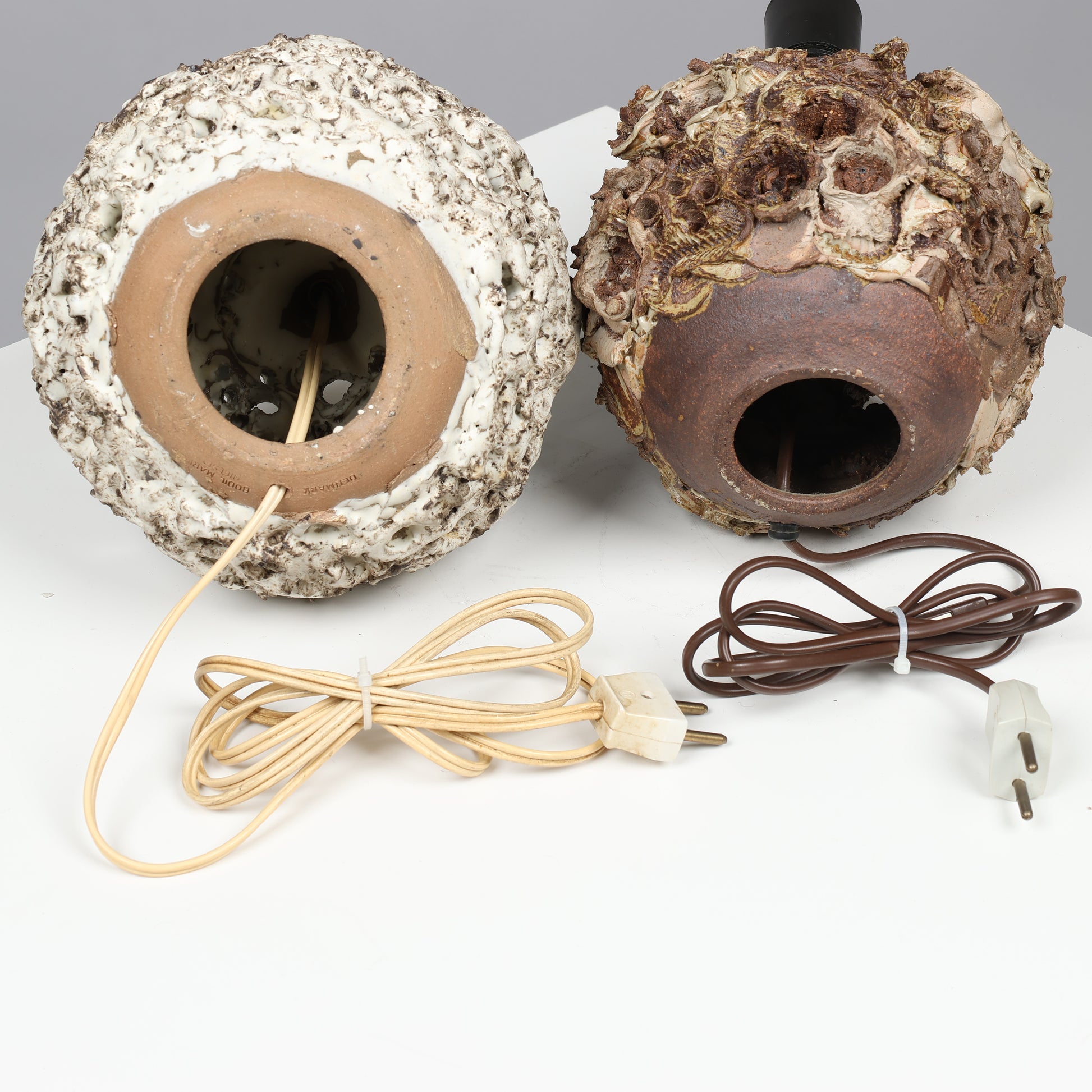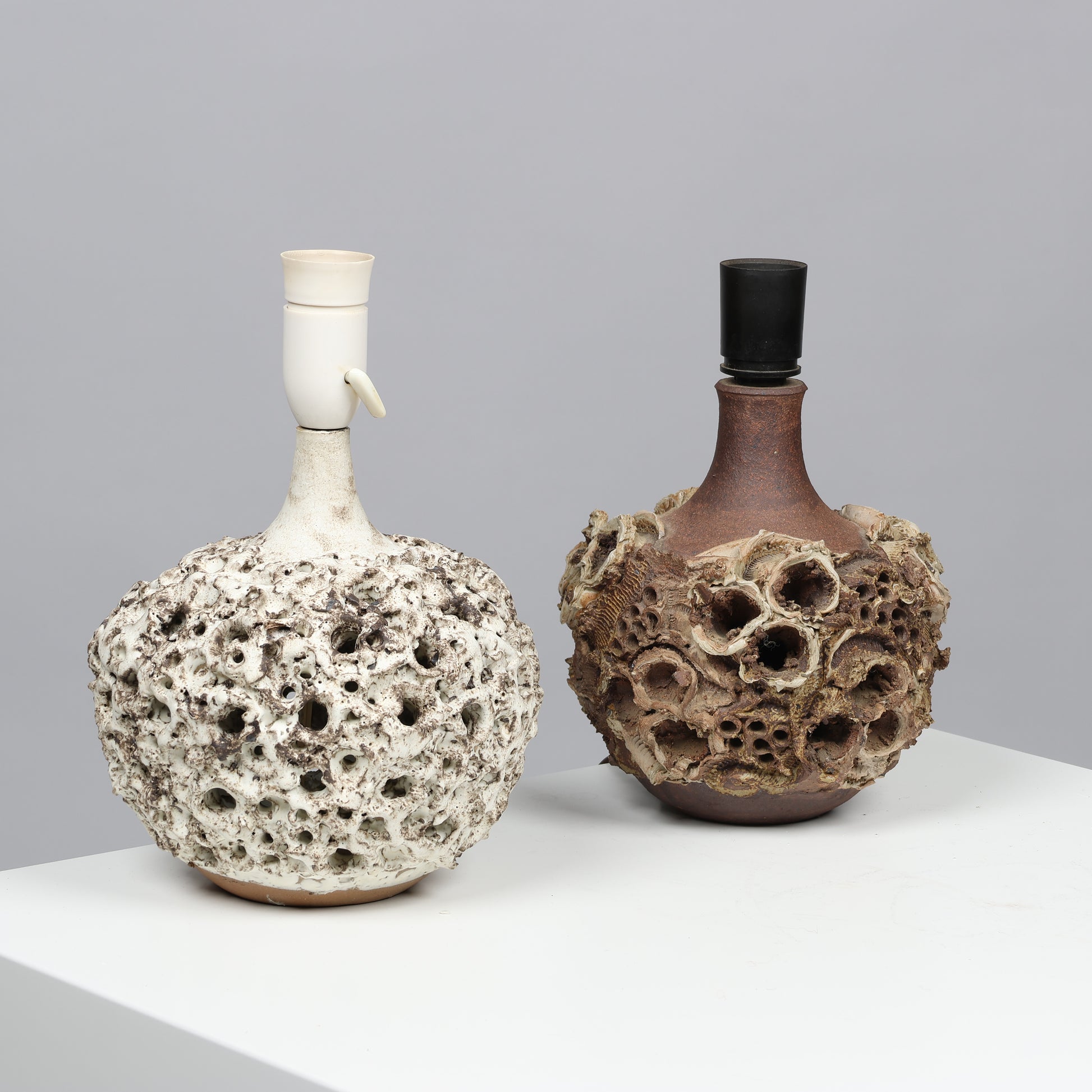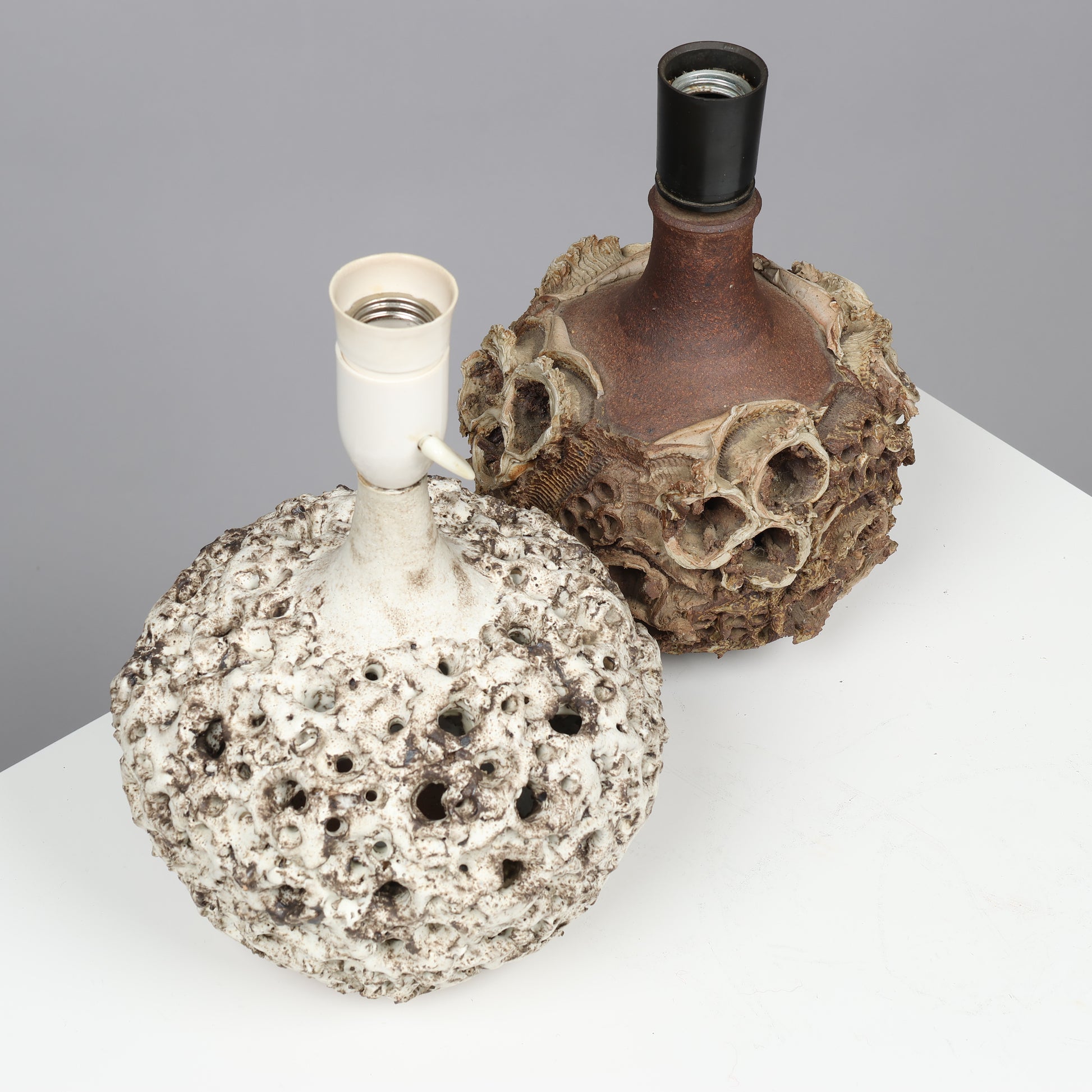 A striking and unique false pair of ceramic lamps created by the artist Bodil Marie Nielsen. Executed in a Brutalist style, these lamps showcase strong sculptural forms and textured ceramic surfaces. Both pieces are in good condition, retaining their original character and artisanal quality.