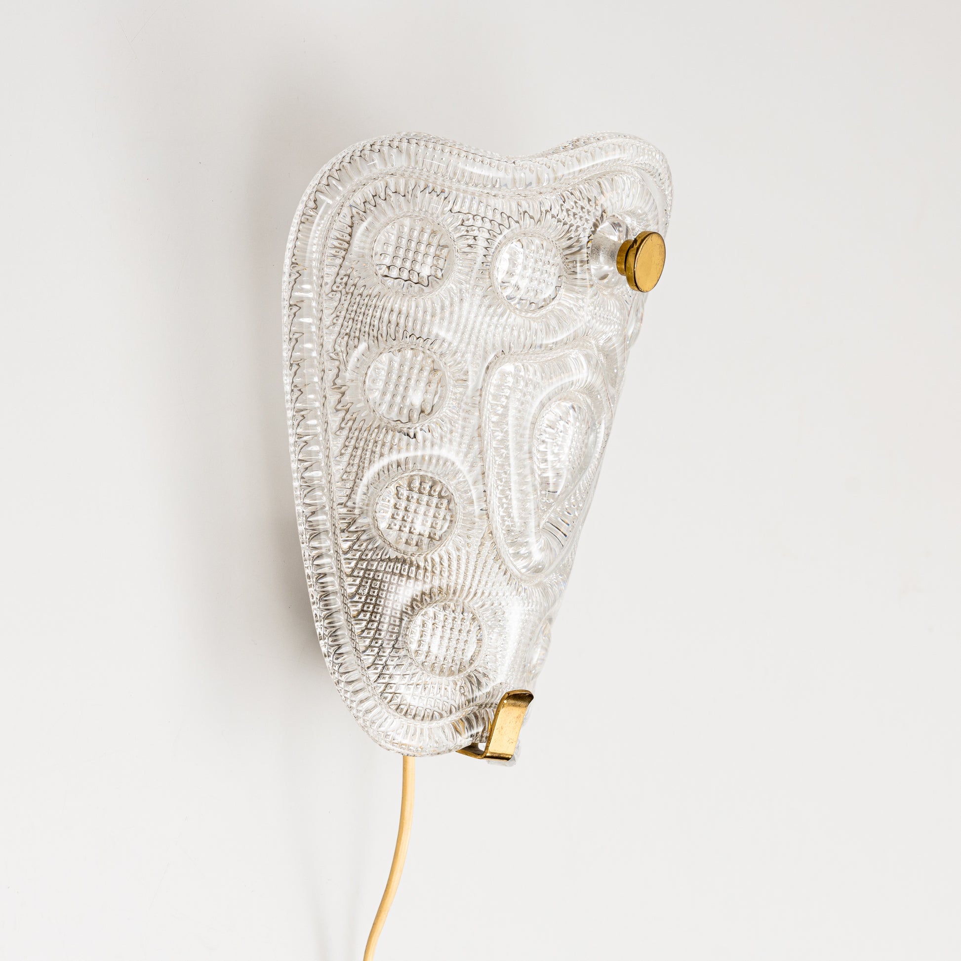 Orrefors crystal and brass sconce by Carl Fagerlund, Sweden, 1950, single candelabra sockets with thick half cone shaped press crystal shades with ornament details in the glass.