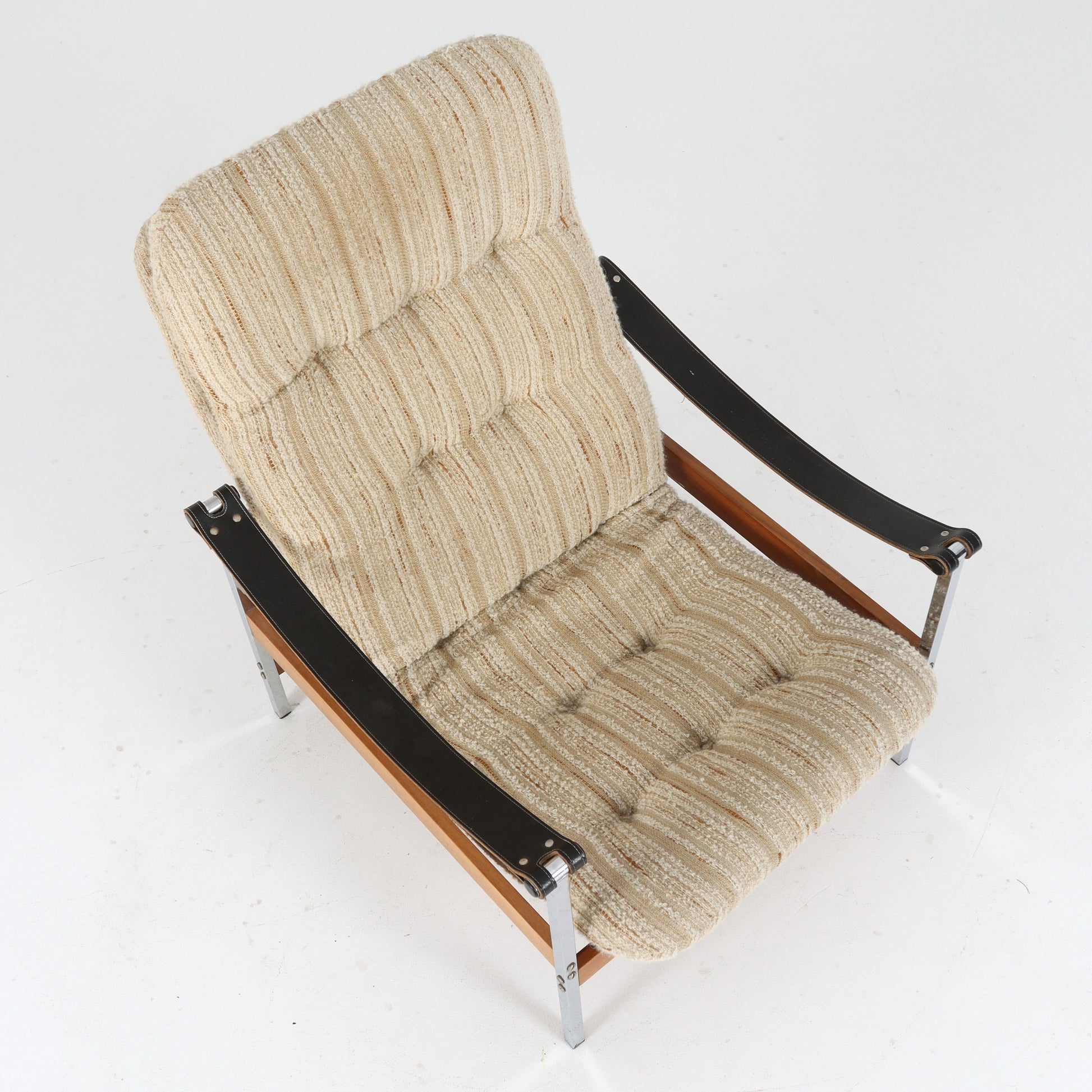 Chromed metal and teak frame, black leather arms and beige original fabric. The armchair is sold with its original striped beige fabric in good vintage condition.