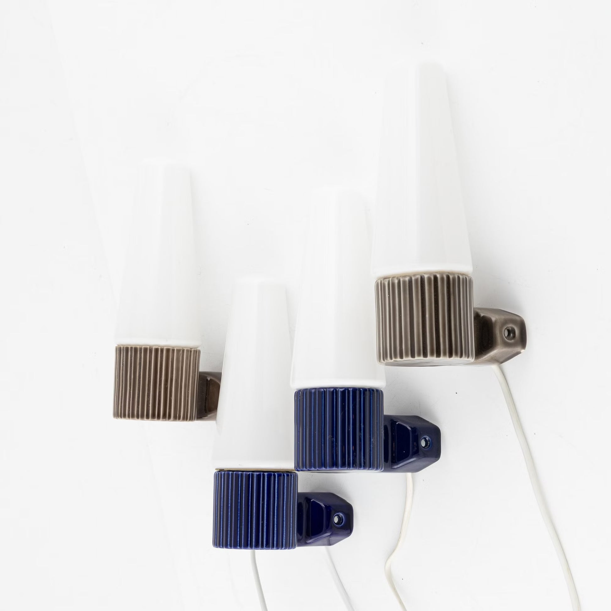 Hans-Agne Jakobsson, six wall lights from the series "Lyx" for IFÖ Electronics, Sweden, 1960's. Gray-glazed ceramics, conical shade in opaque white glass. For one light source each.