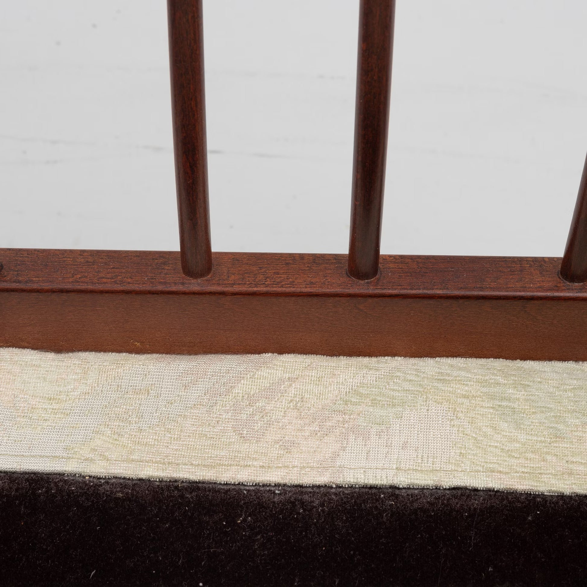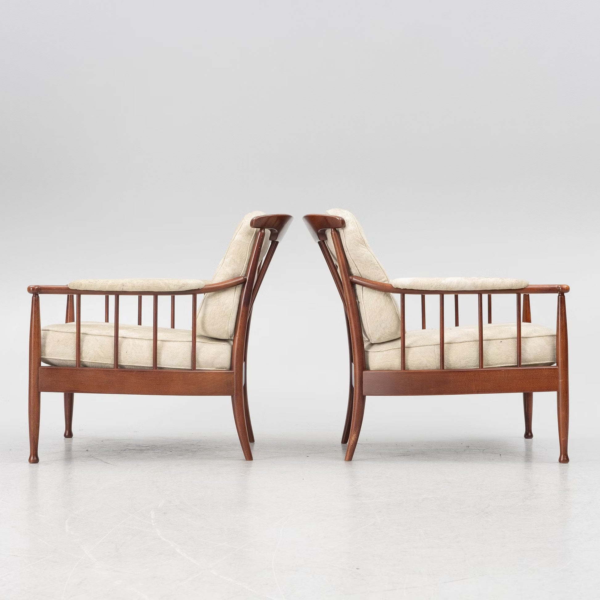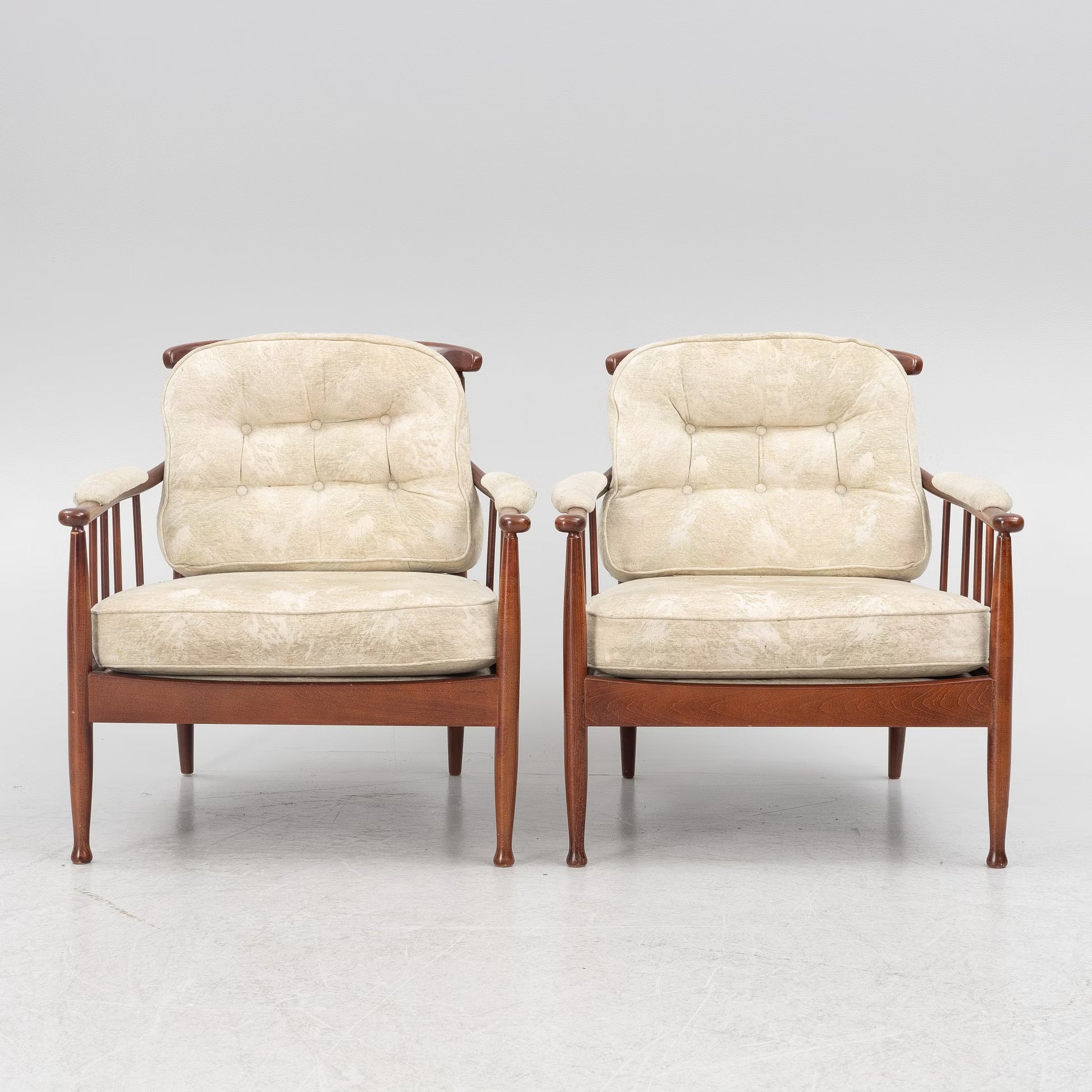 These chairs have backs and sides comprised of symmetrically arranged spindles. As the backs and armrests sit relatively low, the chairs have an open look. The upholstered loose back and seat cushions elevate the visual comfort. The subtle elements of decoration include the tufted buttons on the cushions, the upholstered armrests, and the tapered legs. These Skrindan armchairs are exemplary of Swedish mid-century quality and design to their cores, uniting functionality with an understated, yet interesting and elegant design.