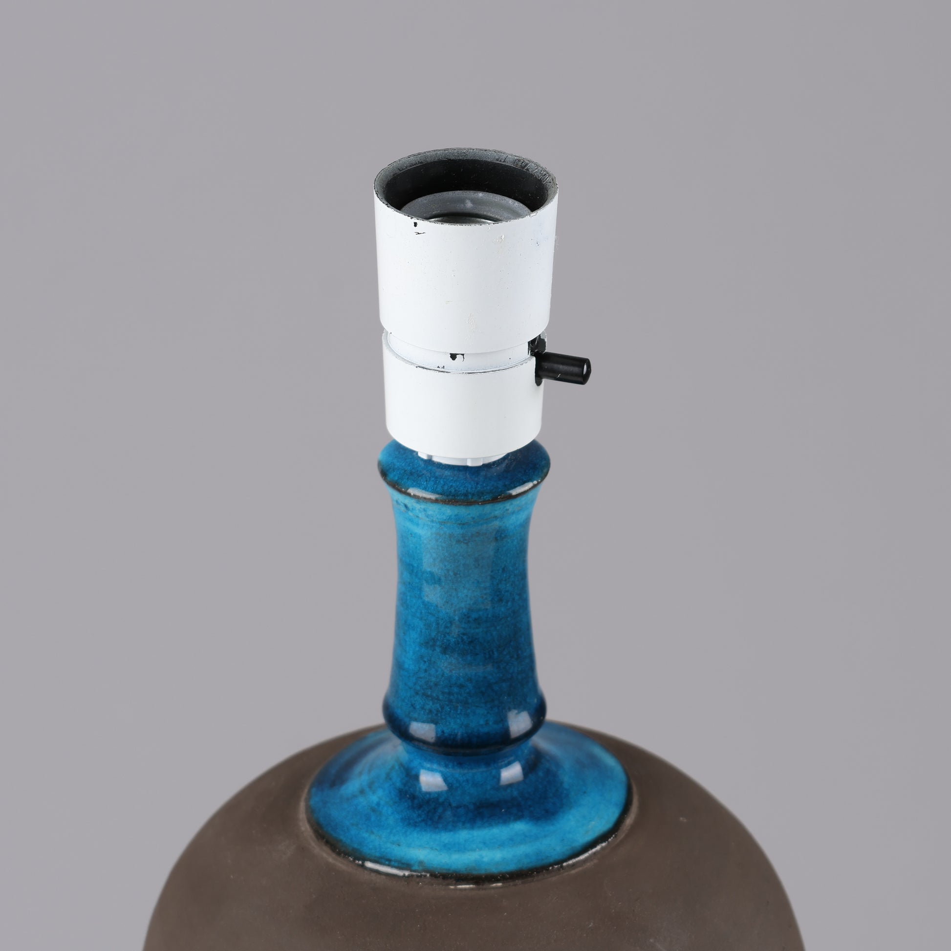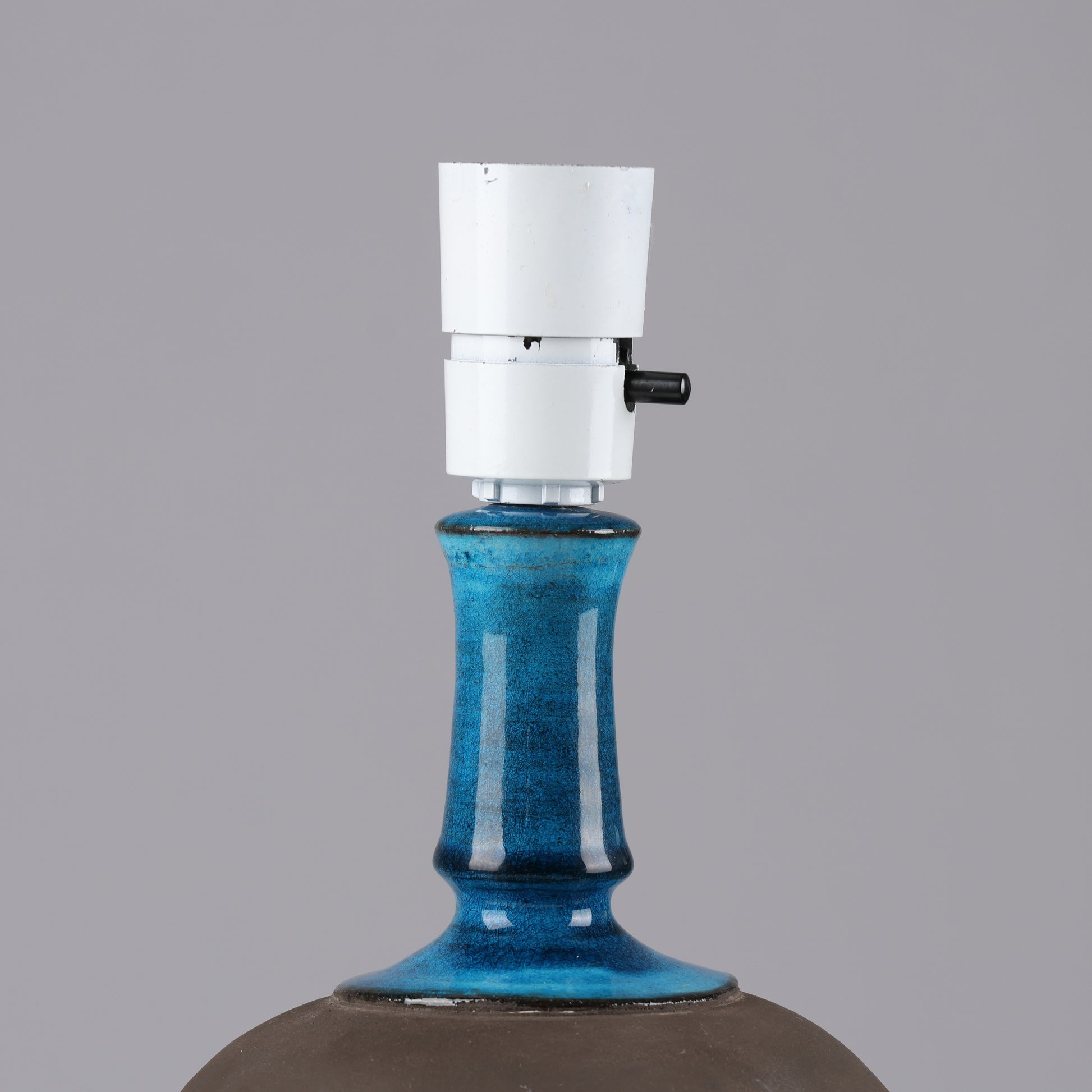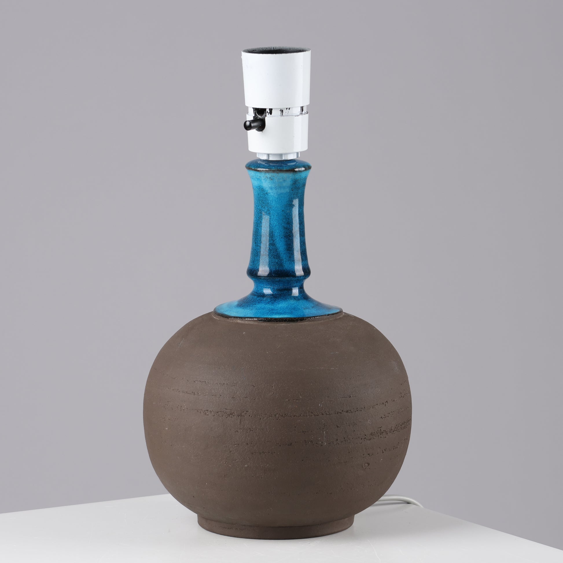 Table lamp made of partly blue-glazed stoneware with slim neck and round base.