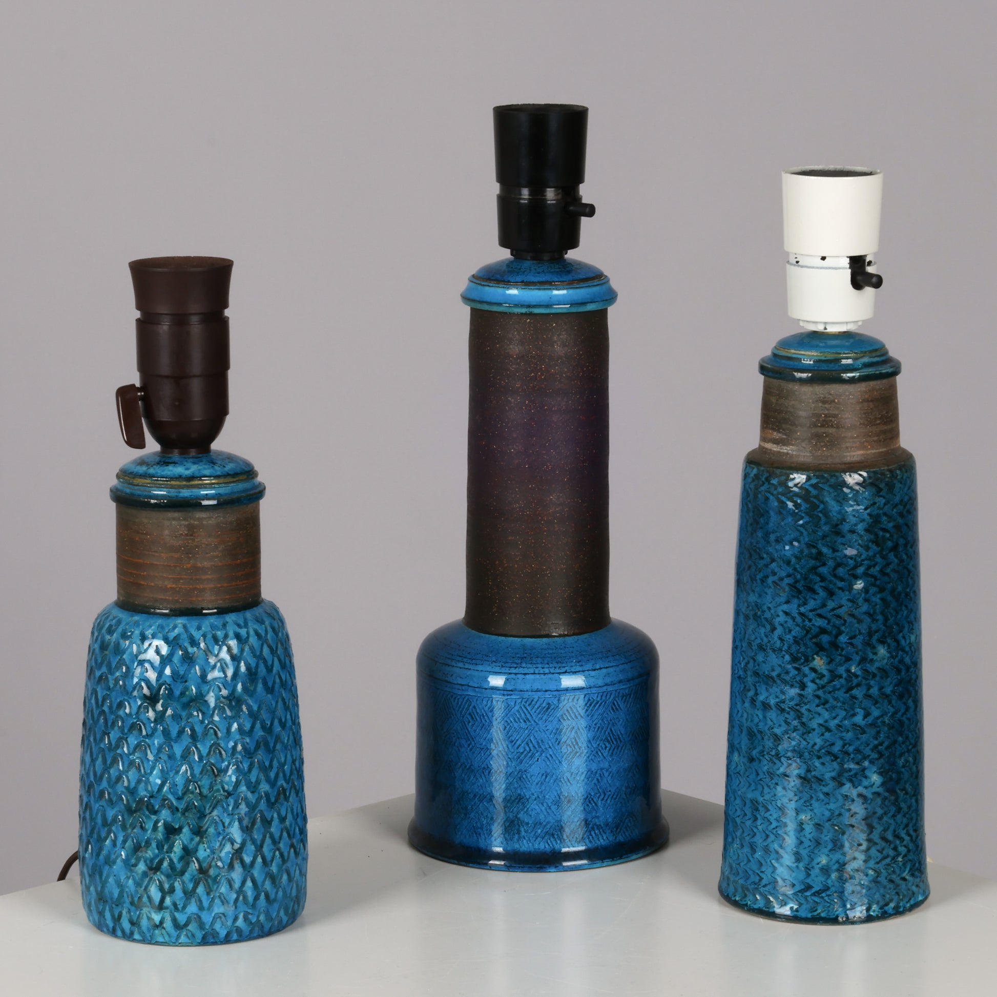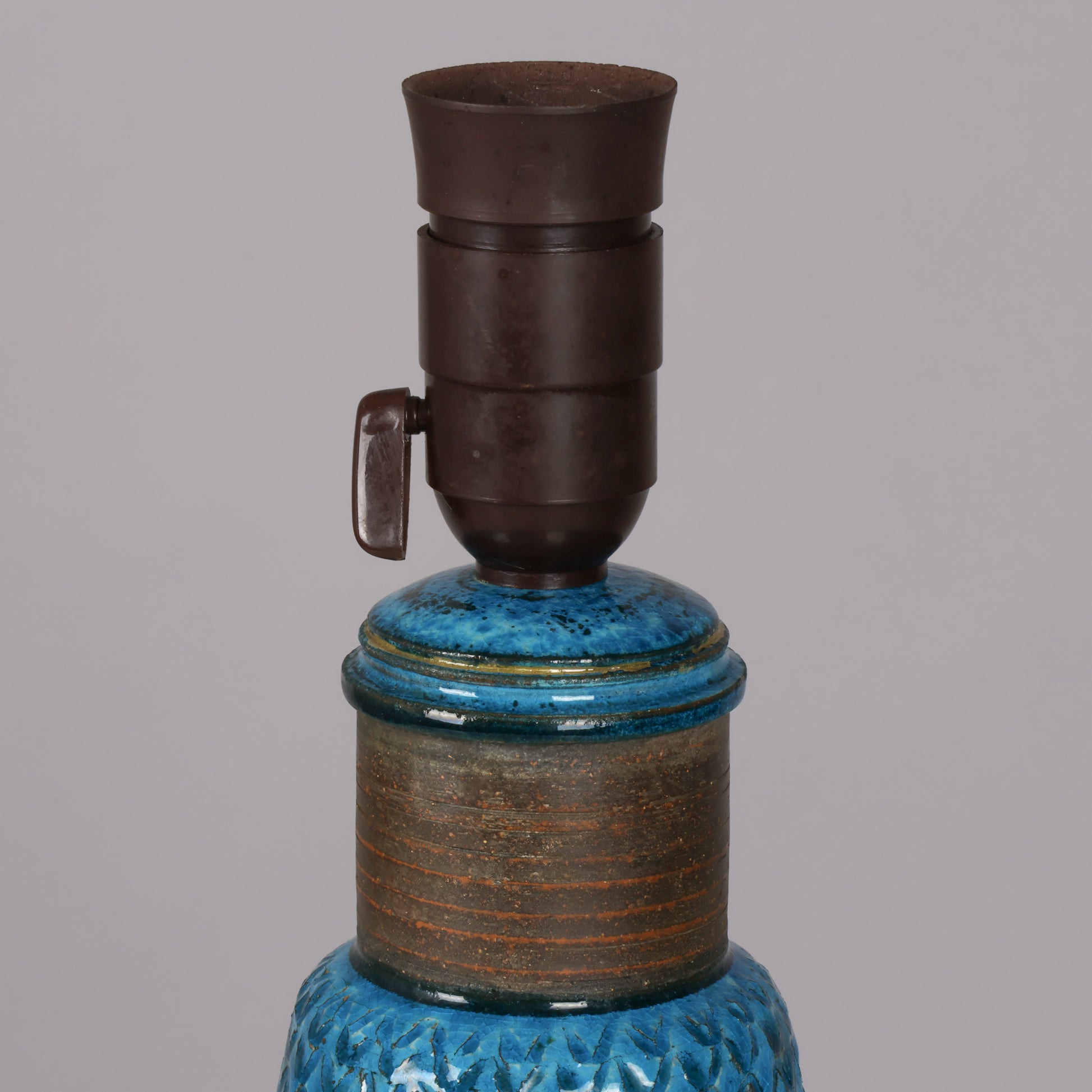 Table lamp made of partly blue-glazed stoneware with slim neck and relief pattern. Signed “Nils HA Denmark” on the bottom.